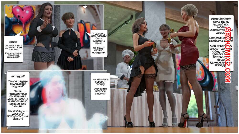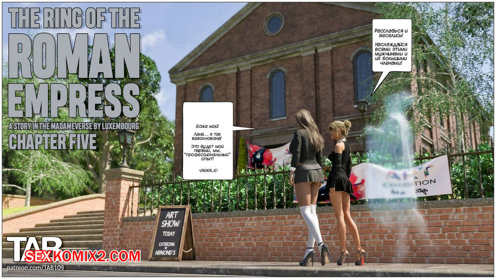 Порно комикс Кольцо Римской Императрицы. Часть 5. The Ring of the Roman Empres. Tab109 Юные красотки отправились на мероприятие, организованное мадам Маделон. Девушки положили глаз на темнокожих парней, желая поскорее насладиться их черными членами.
