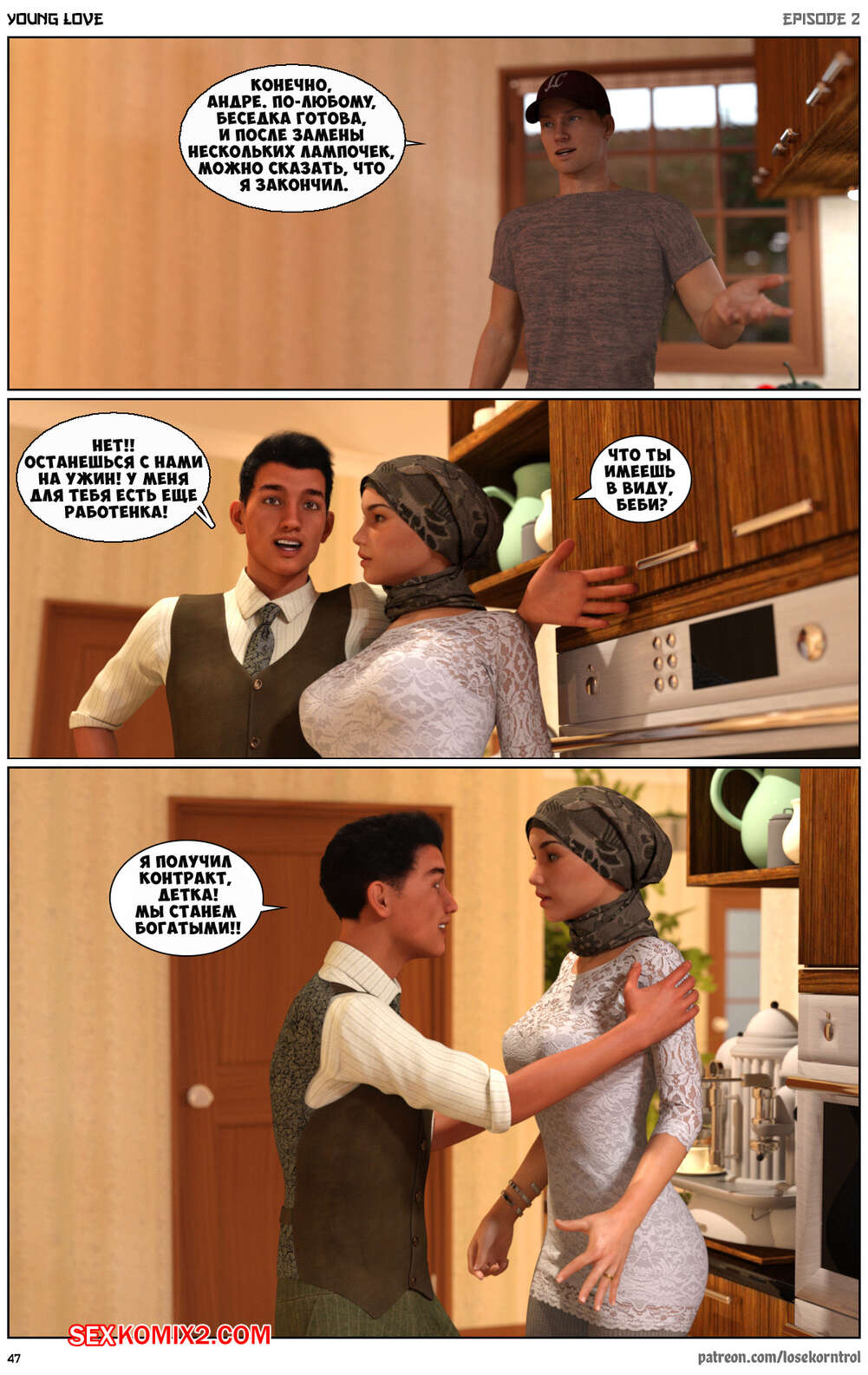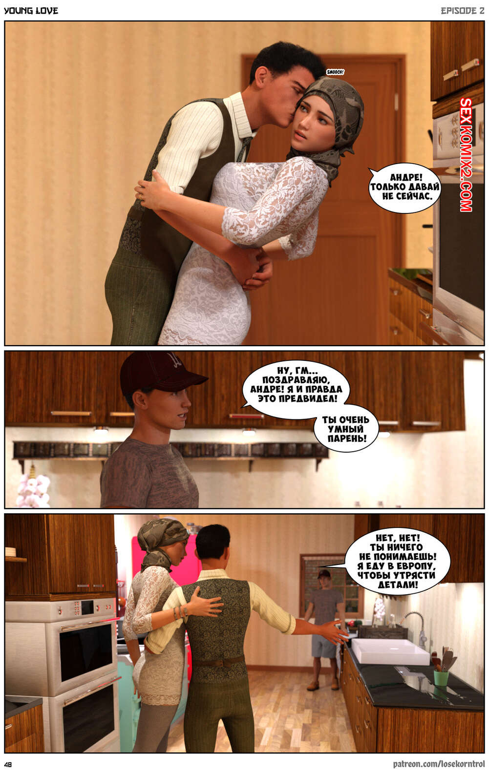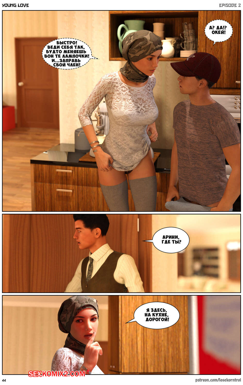 Порно комикс Любовная история. Часть 2. Юная любовь. Young love. Losekorntrol Горячая красотка брюнетка снова воспользовалась тем, что ее муж уехал из дома. Когда к ней пришел молодой паренек для работы, она стала его соблазнять и начала сосать большой хуй парня, а затем дала ему себя выебать.
