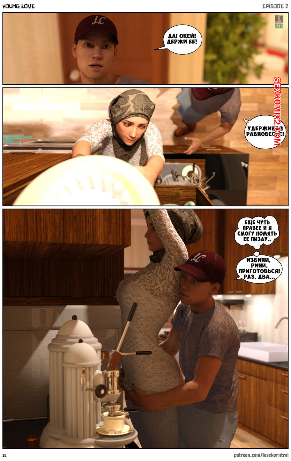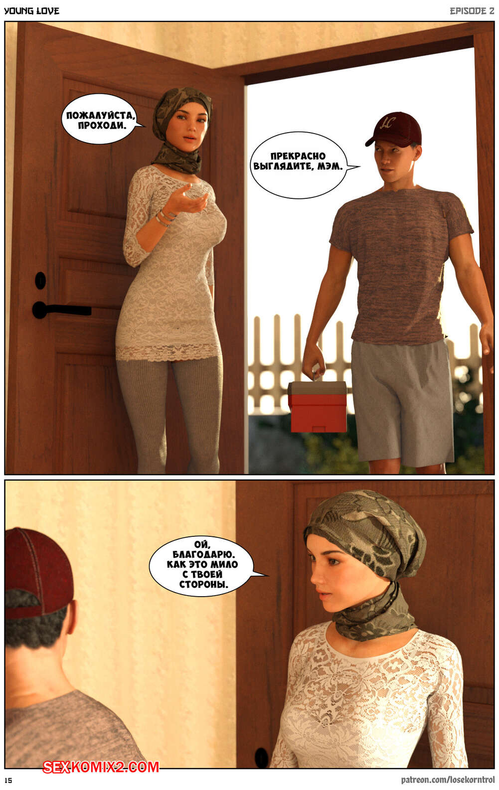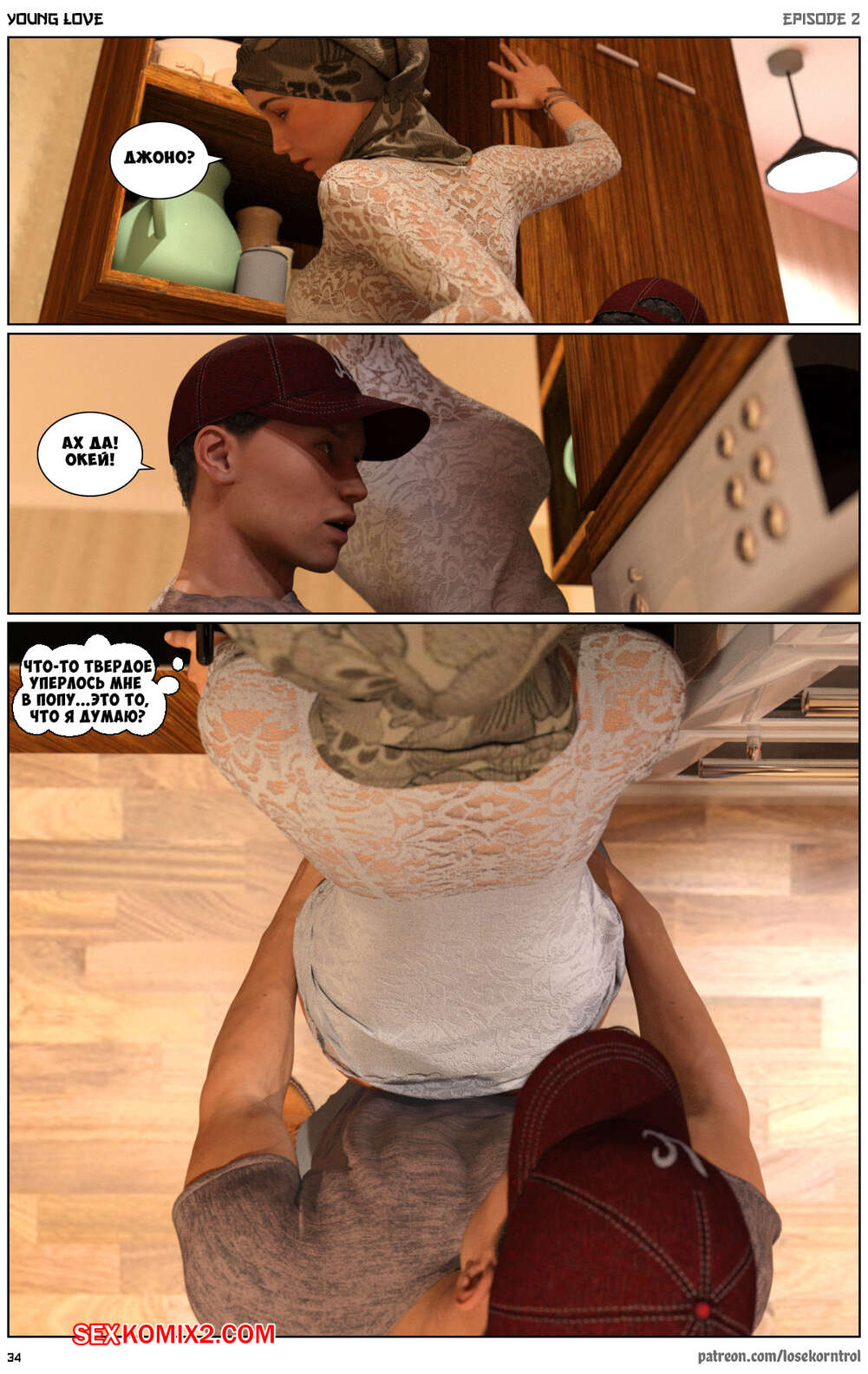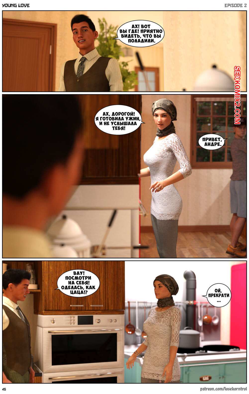Порно комикс Любовная история. Часть 2. Юная любовь. Young love. Losekorntrol Горячая красотка брюнетка снова воспользовалась тем, что ее муж уехал из дома. Когда к ней пришел молодой паренек для работы, она стала его соблазнять и начала сосать большой хуй парня, а затем дала ему себя выебать.